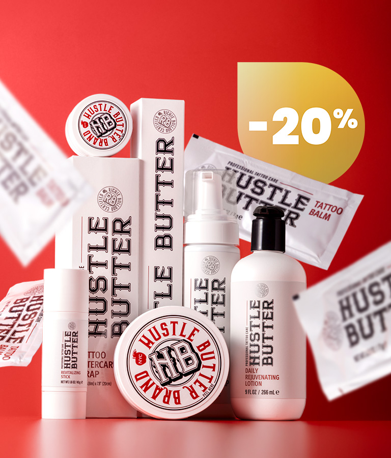 En lo que se refiere a cremas para tatuar, no podemos olvidarnos de recomendar Hustle Butter Deluxe como uno de los mejores productos para después de tatuar que también se puede utilizar antes y durante el proceso de tatuaje. También somos grandes fans de Recovery Aftercare, y disponemos de su crema, vendas y jabón para el cuidado posterior del tatuaje.