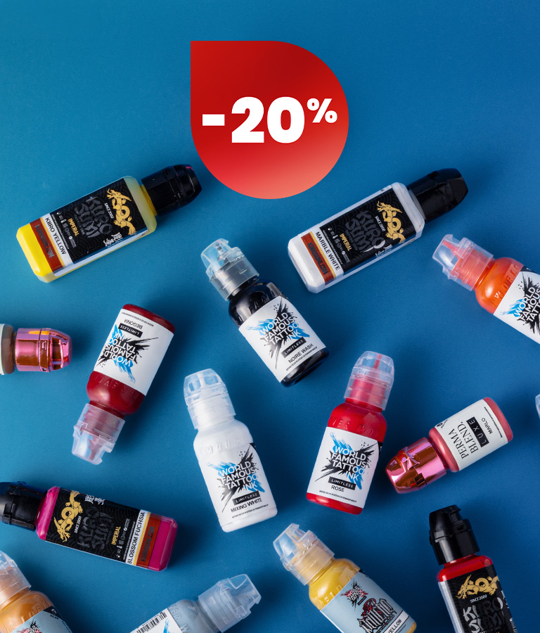 Nuestra gama de tintas para tatuar cubre todos los tonos del espectro, desde el negro hasta el blanco. Puedes comprar por marca o por colores. Ofrecemos sets completos, lavados grises y tonos, además de tonos carne y soluciones de mezcla, ¡y por supuesto tinta negra para tatuar todos los estilos y especialidades!