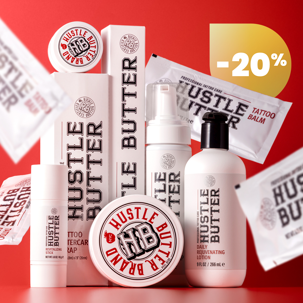 ¡Ya están aquí los descuentos de febrero! ¡Consigue un 20% de descuento en toda la gama de productos Hustle Butter, la marca premium de cuidado de tatuajes en la que confían los artistas!
