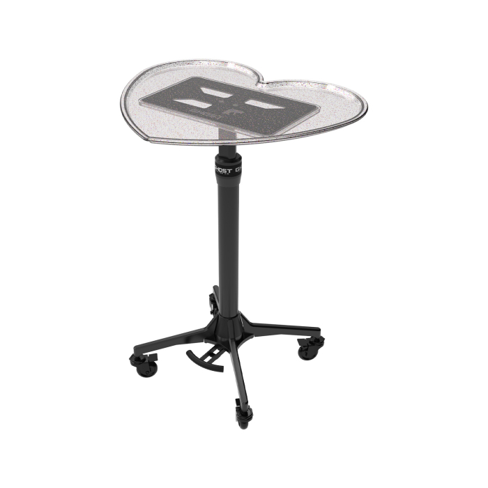 La base de la bandeja Ghost presenta un sistema de ajuste de altura con palanca de pie, una innovación en la industria, que te permite ajustar la altura de tu bandeja de 24 a 36" (aprox. 61 x 91 cm) sin riesgo de contaminación cruzada.