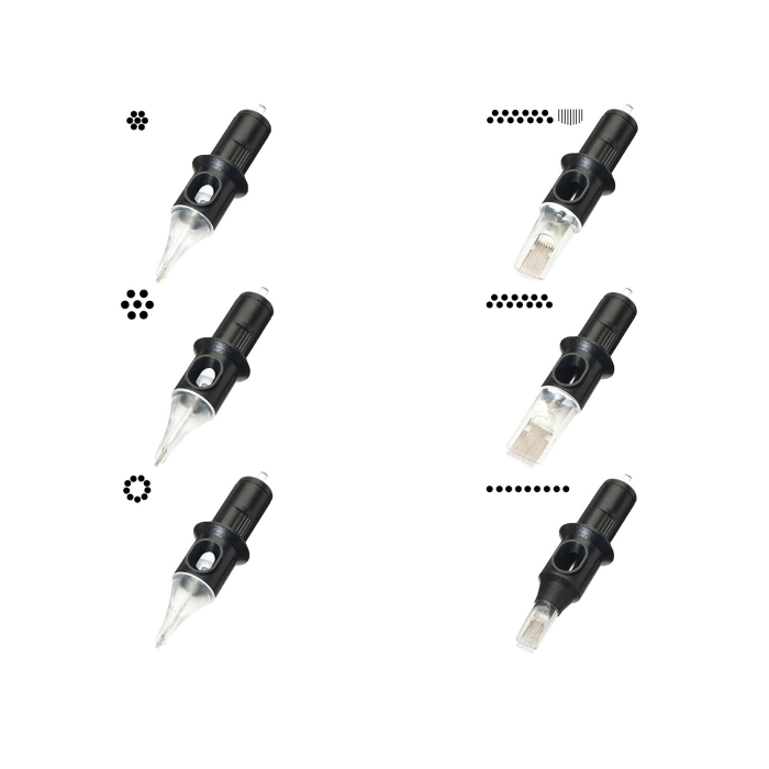 Los cartuchos de agujas Cheyenne Safety se cambian rápidamente y tienen una membrana integrada que mantiene tinta y sangre en el cartucho y aisladas del grip. Las agujas del cartucho se proyectan por el extremo cuando el mecanismo de la barra de resortes de carga de las agujas se presiona hacia dentro. Y las agujas vuelven naturalmente a su posición de salida cuando la presión se relaja, haciéndolo seguro y fácil de llevar.