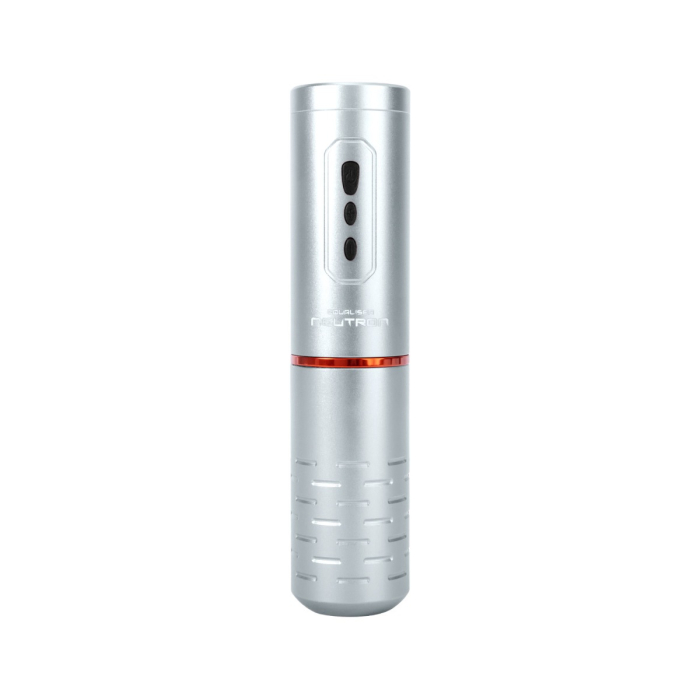 El lápiz de tatuaje inalámbrico Neutron de Equaliser tiene una carcasa de aluminio y cuenta con una pantalla digital nítida y tres botones para operar la máquina. La pantalla digital muestra el voltaje (V), el nivel de la batería (%) y el tiempo transcurrido desde que se encendió la máquina (se reinicia cada vez que se apaga el Neutron).