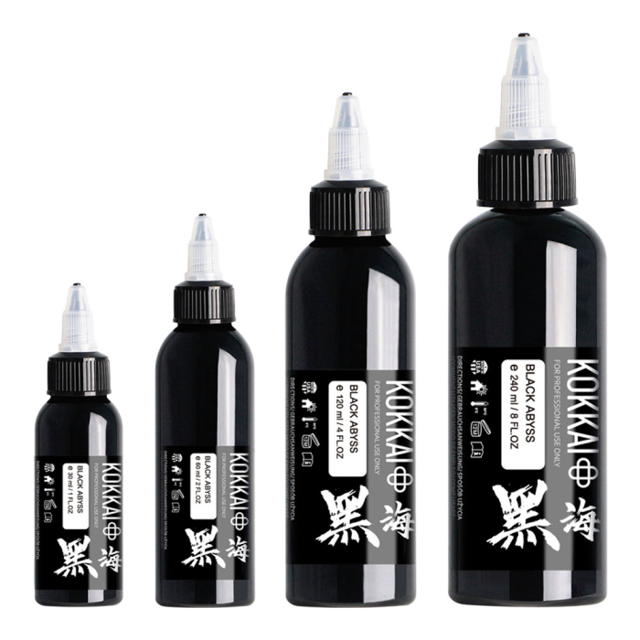 Experience unmatched depth with Kokkai Sumi Ink in Black Abyss, the darkest black in the range, designed for bold, crisp lines and solid, saturated fills. This rich, long-lasting black maintains its intensity over time, making it a go-to choice for blackwork and blackout tattoos.
