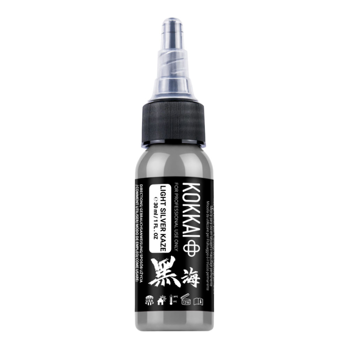 Achieve soft, subtle shading with Kokkai Sumi Ink in Light Silver Kaze, a delicate light grey designed for creating smooth gradients and gentle highlights. This versatile tone is ideal for adding dimension and softness to black and grey tattoo work.