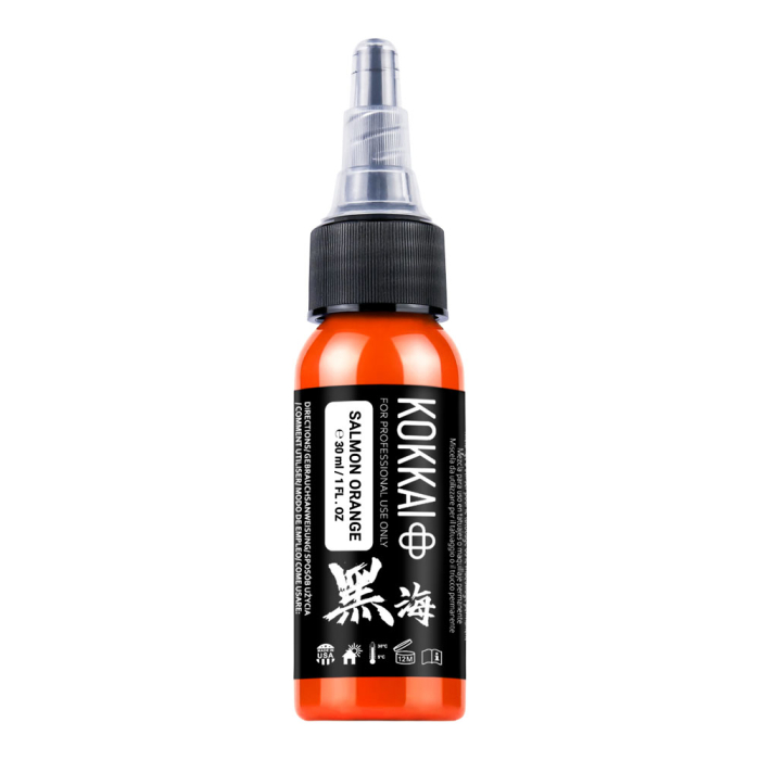 Make your designs shine with Kokkai Sumi Ink in Salmon Orange, a vibrant warm orange ideal for dynamic highlights, soft gradients, and bold accents. Perfect for colour surrealism, new school, and neo-traditional tattoos.