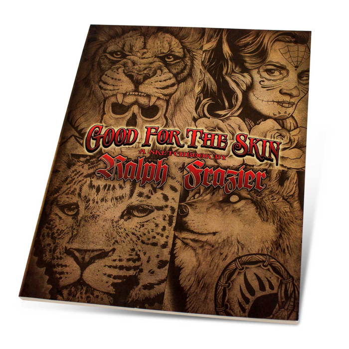 Good for the Skin, por Ralph Frazier, tiene 40 páginas por una sola cara de creaciones en blanco y negro (black and grey). Este libro quiere servir de inspiración a artistas tatuadores. Las páginas están impresas en cartulina de colores. Ralph es alumno de Stinky Monkey Tattoos.