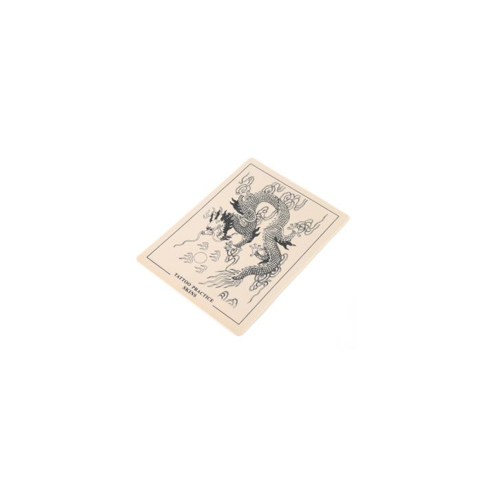 Esta lámina de piel para practicar el tatuaje es perfecta ejecutar el tatuaje de varios diseños antes de trabajar sobre piel real. Esta lámina contiene el diseño de un dragón. La piel es de unos 21 x 15 centímetros.