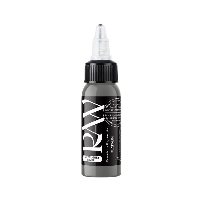 Metal Grey Light es una tinta para tatuar de color gris muy suave que se puede aclarar u oscurecer y se introduce fácilmente en la piel, de la gama Platinum de Raw Premium Pigments, que cumple con la normativa EU REACH.