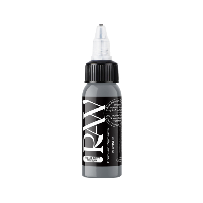 Metal Grey Medium es una tinta para tatuar de color gris profundo y sólido con un toque de color patentado para asegurar que cicatrice sin tonos verdes o amarillos, de la gama Platinum de Raw Premium Pigments, que cumple con la normativa EU REACH.