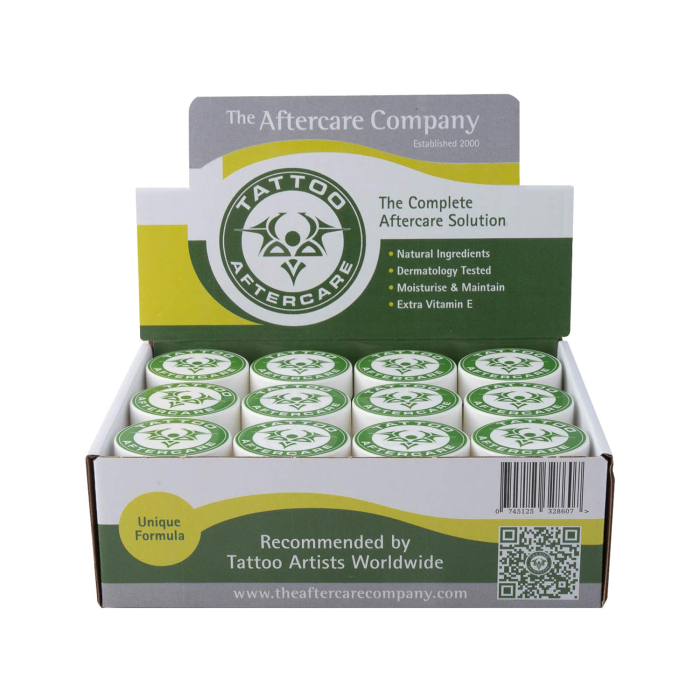 El tratamiento para el cuidado despues del tatuaje Aftercare® deThe Aftercare Companyes el primer cuidado posterior de triple acción diseñado para suavizar, hidratar y mantener la calidad de los tatuajes a largo plazo. Este cuidado mejorará de principio a fin y preservará la vivacidad y el brillo de la tinta de tus tatuajes, protegiendo la audacia del negro y la vibración de los colores. Cuando se usa en tatuajes curados, revitalizará y rejuvenecerá la piel y ayudará a revivir el brillo de los tatuajes más viejos. Ganador del primer Gold Award de Cruelty Free International (anteriormente BUAV), Tattoo Aftercare® utiliza ingredientes 100% naturales y está libre de parabenos, conservantes, petróleo, alcohol y colorantes de grado alimentario. Su fórmula se basa en una mezcla única de lavanda, árbol de té y Niaouli, es rica en vitaminas A, D y E, y ha sido especialmente diseñada para reducir las costras y la picazón, hidratar y suavizar la piel y acelerar la curación. proceso manteniendo la vibración del color.